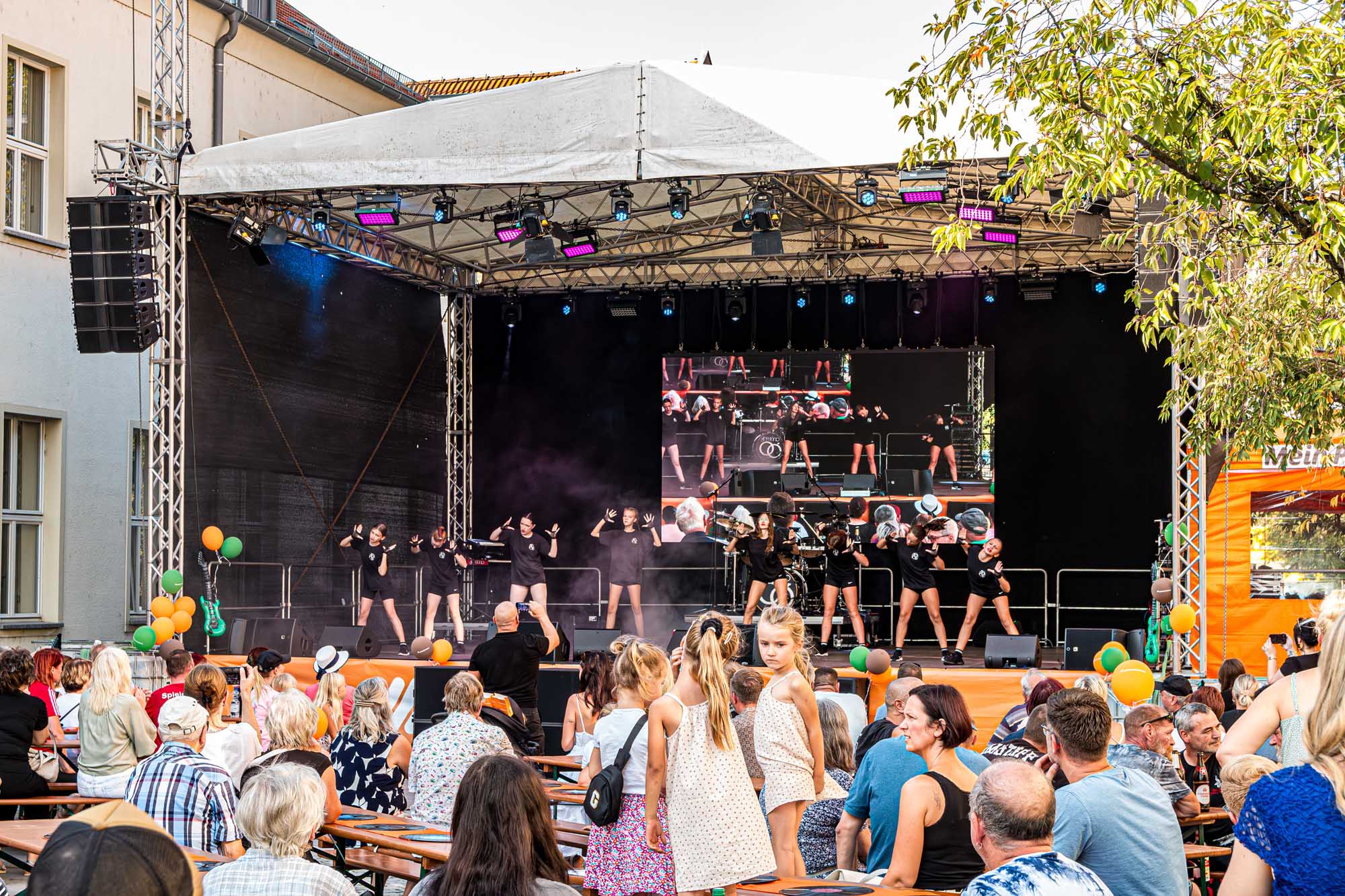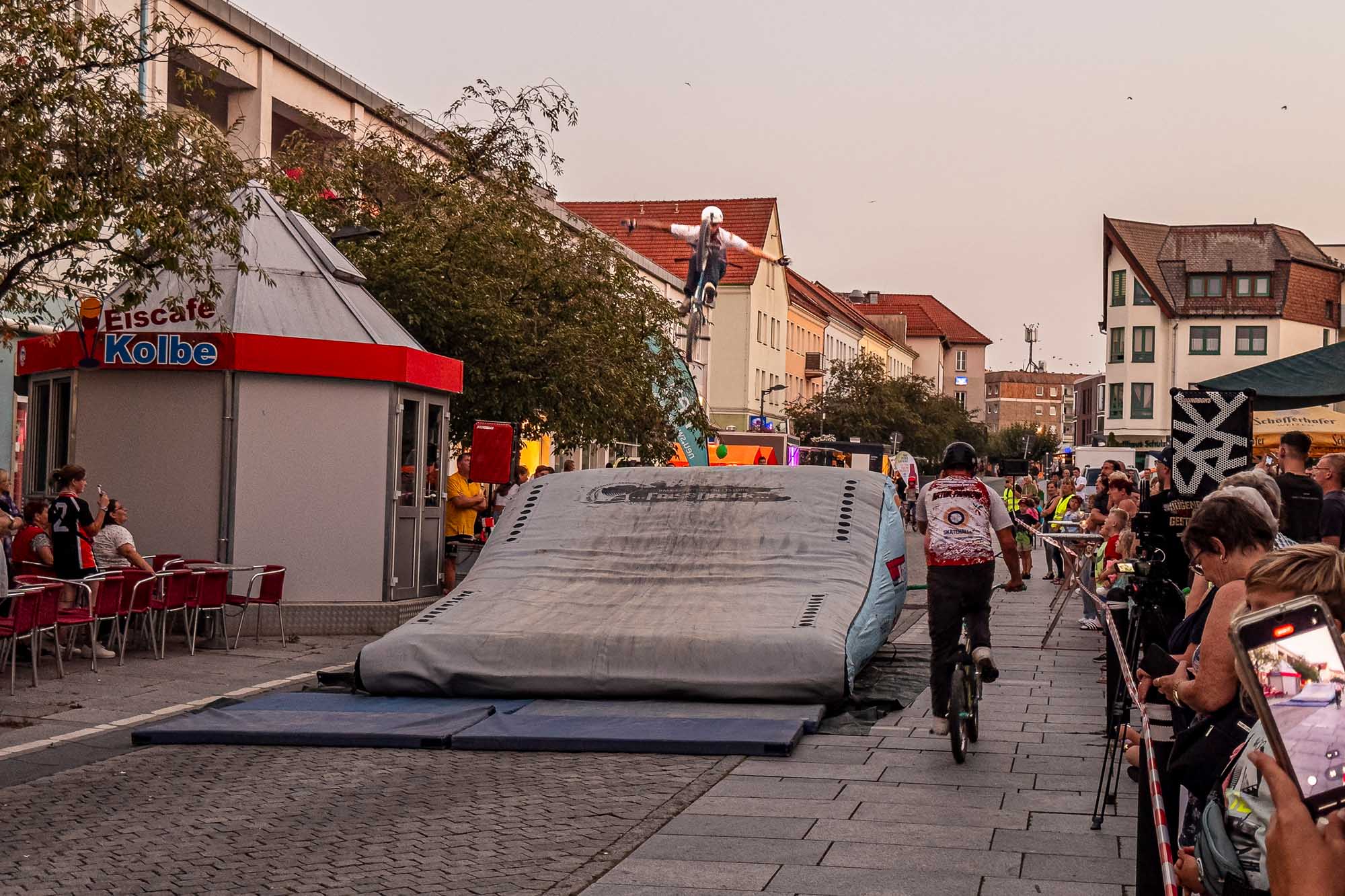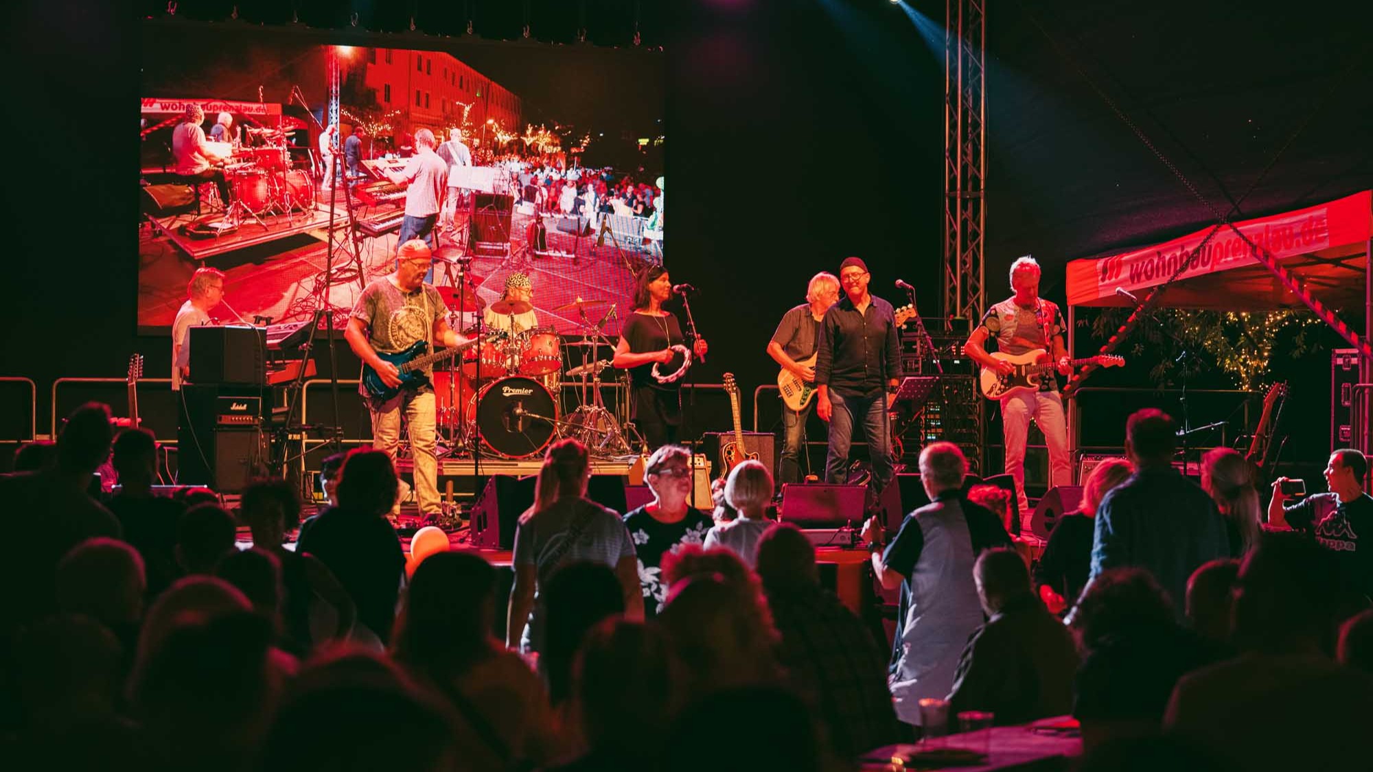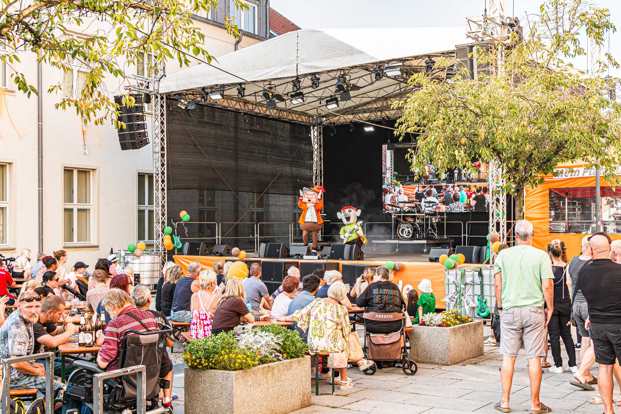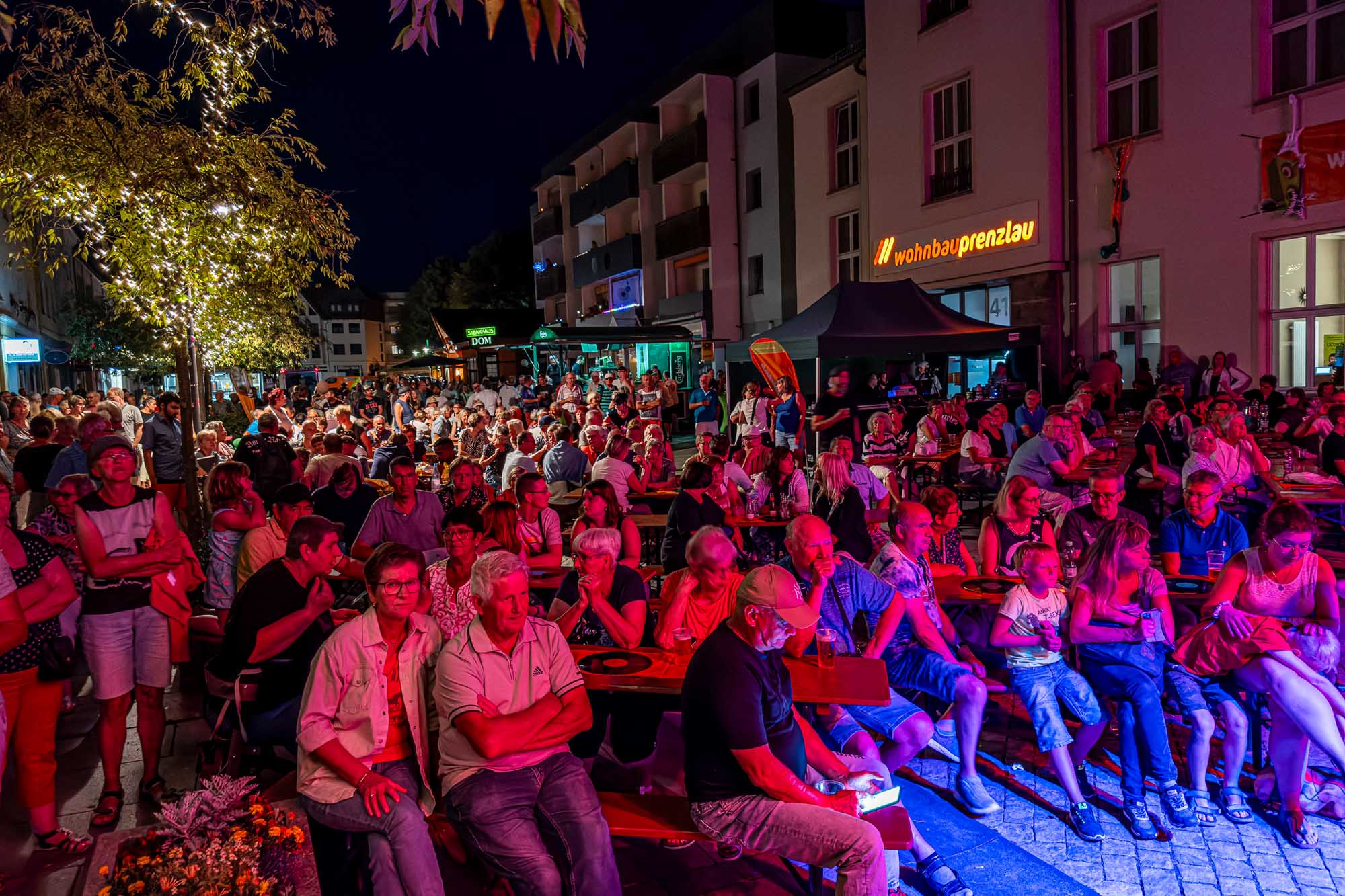 »Prenzlau macht sein Ding«, sang Udo Lindenberg Double EXE, der den musikalischen Auftakt mit beliebten Songs der deutschen Rock-Ikone machte. Während der Umbauzeiten sorgte die Berliner Frauengruppe »Brass Appeal« mit Blasinstrumenten für gute Laune. Anschließend begeisterte die Big Band Uckermark mit einem breiten Repertoire an bekannten Liedern, die Jung und Alt zum Mitwippen brachten. Besonders großen Anklang fand das Tanzstudio Swing, das zu rockigen Klängen eine energiegeladene Zumba-Performance zeigte. Wohnbau-Maskottchen Eddy und Friedrich ließen es sich nicht nehmen, sich ebenfalls tänzerisch zu versuchen und brachten die Prenzlauerinnen und Prenzlauer mit einer eigenen Choreografie zu »We Will Rock You« zum Jubeln. Auch die Nachwuchsband Stereono aus Rostock, um den Prenzlauer Gian Luca Urland, war Teil des Programms. Die Band beeindruckte mit ihrem musikalischen Können. Für gute Stimmung sorgten »Die Kassenpatienten« aus Leipzig, die mit bekannten Liedern der »Ärzte« und einer großen Portion Humor das Publikum begeisterten. Die BMX-Show »Friss Dreck«, die mitten in der Friedrichstraße stattfand, ließ vor allem die Herzen der jungen Zuschauerinnen höherschlagen. Die Jungs zeigten spektakuläre Sprünge und brachten die Menge zum Staunen. Als krönender Abschluss des Abends rockte Prenzlaus Lieblingsband F.altenrock die Bühne. Es wurde getanzt, mitgesungen und ausgelassen gefeiert.