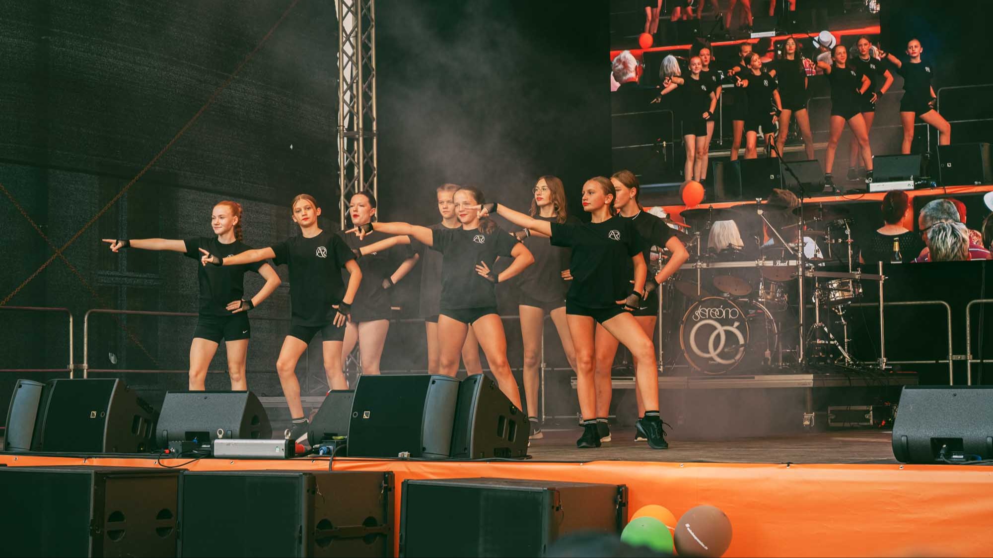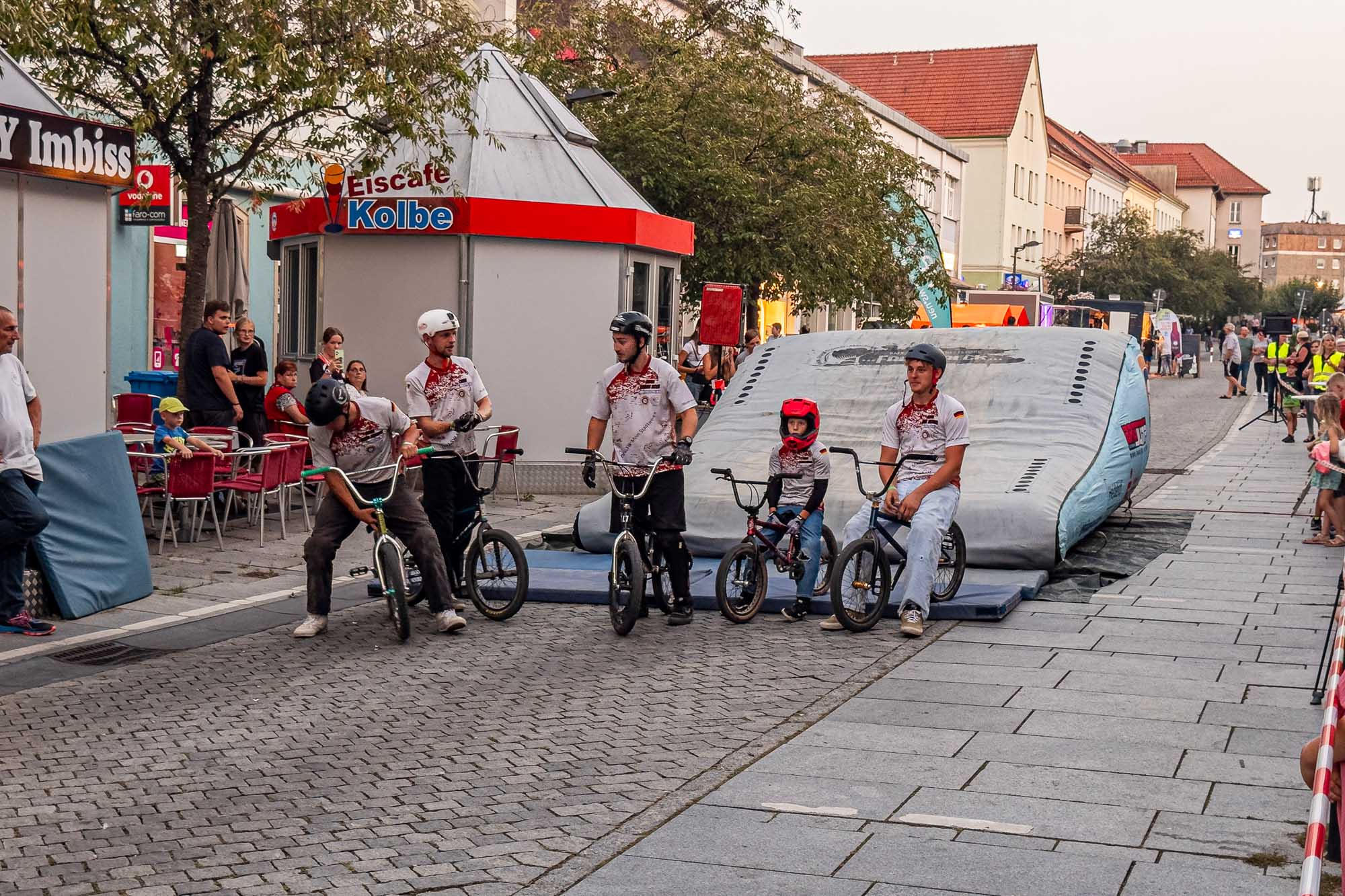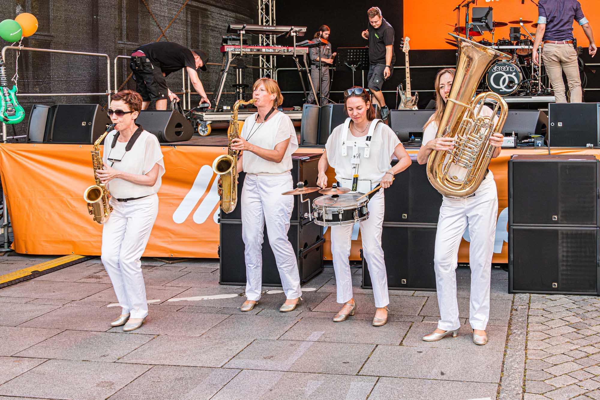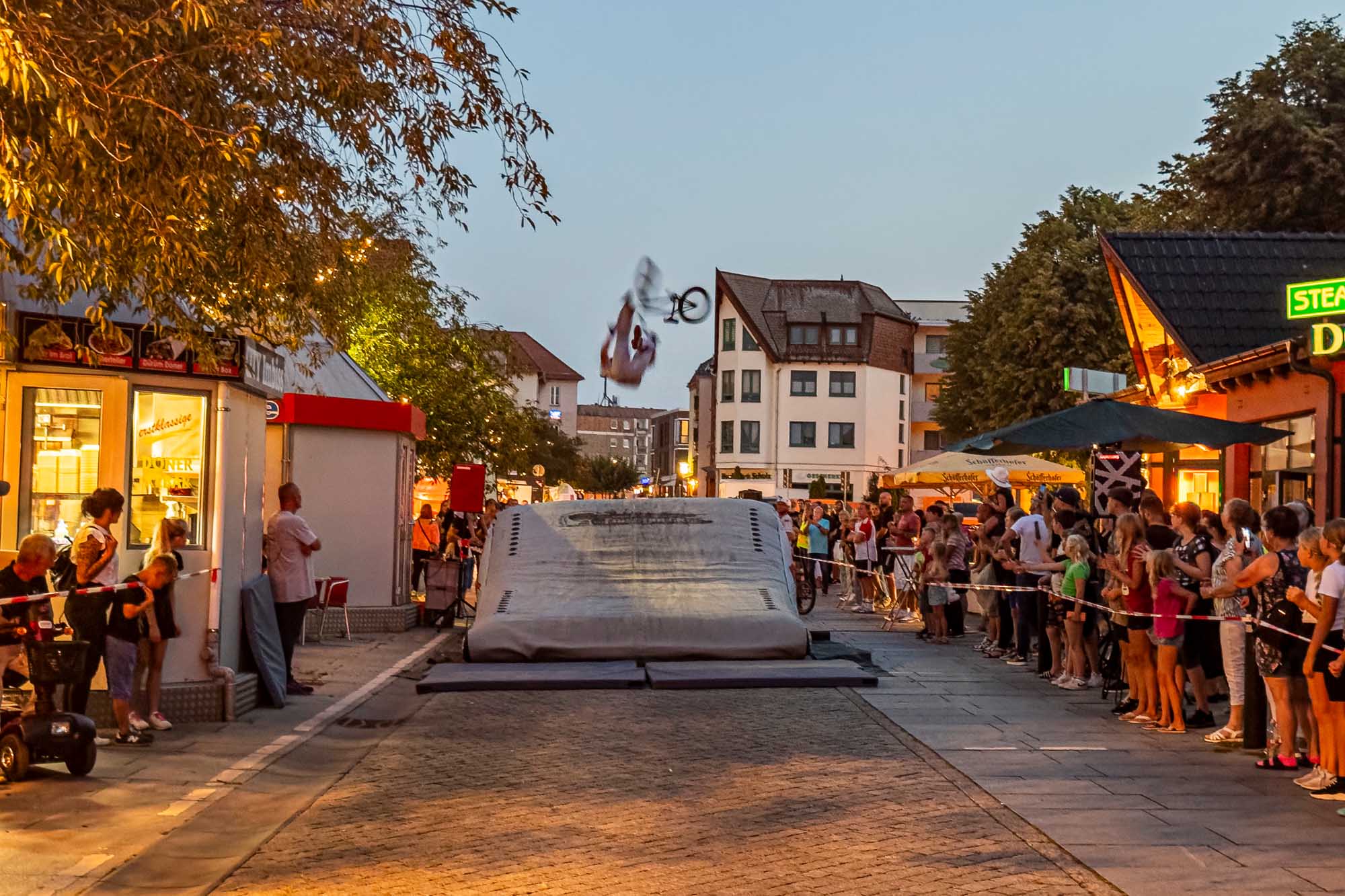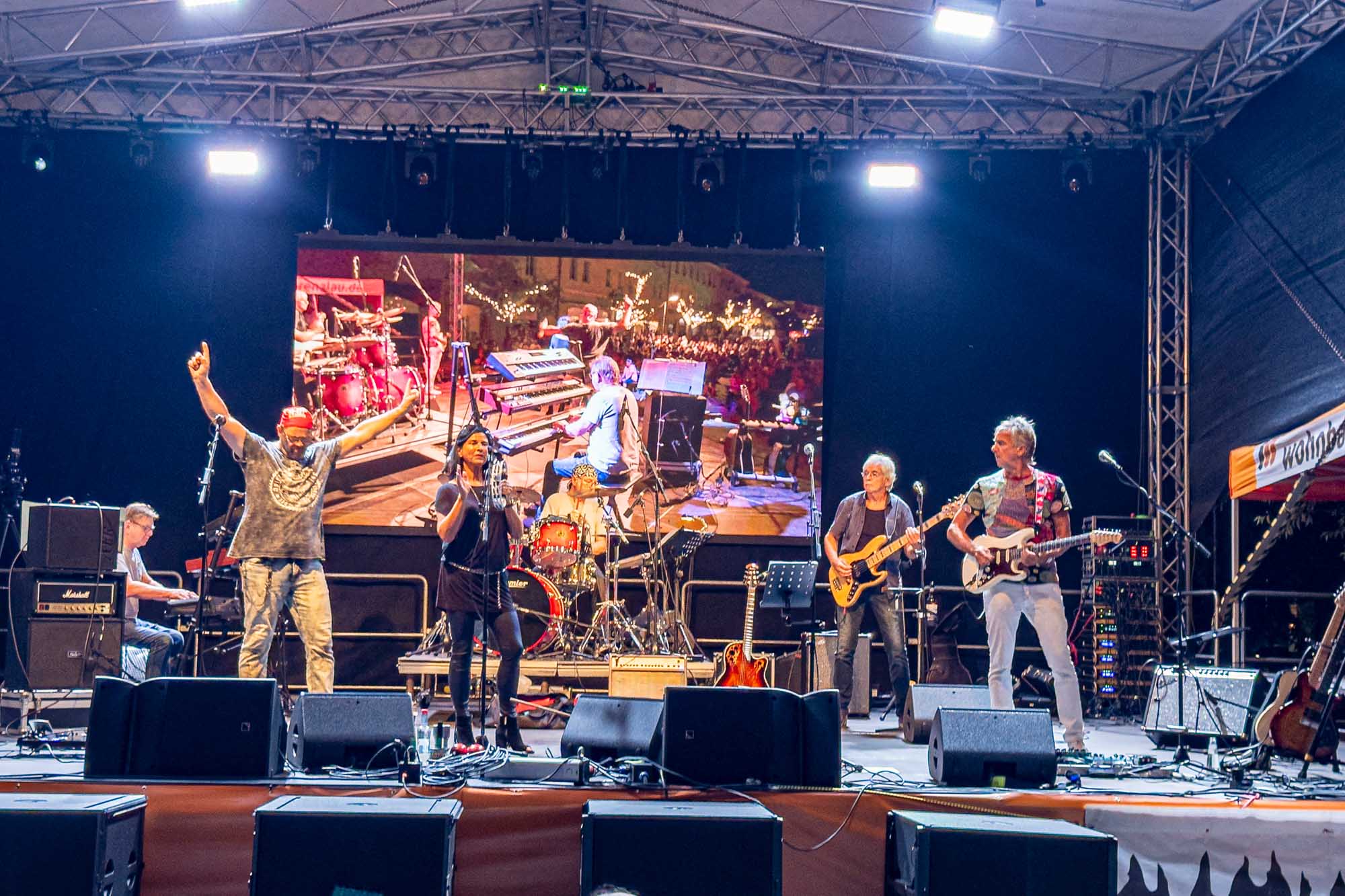 »Prenzlau macht sein Ding«, sang Udo Lindenberg Double EXE, der den musikalischen Auftakt mit beliebten Songs der deutschen Rock-Ikone machte. Während der Umbauzeiten sorgte die Berliner Frauengruppe »Brass Appeal« mit Blasinstrumenten für gute Laune. Anschließend begeisterte die Big Band Uckermark mit einem breiten Repertoire an bekannten Liedern, die Jung und Alt zum Mitwippen brachten. Besonders großen Anklang fand das Tanzstudio Swing, das zu rockigen Klängen eine energiegeladene Zumba-Performance zeigte. Wohnbau-Maskottchen Eddy und Friedrich ließen es sich nicht nehmen, sich ebenfalls tänzerisch zu versuchen und brachten die Prenzlauerinnen und Prenzlauer mit einer eigenen Choreografie zu »We Will Rock You« zum Jubeln. Auch die Nachwuchsband Stereono aus Rostock, um den Prenzlauer Gian Luca Urland, war Teil des Programms. Die Band beeindruckte mit ihrem musikalischen Können. Für gute Stimmung sorgten »Die Kassenpatienten« aus Leipzig, die mit bekannten Liedern der »Ärzte« und einer großen Portion Humor das Publikum begeisterten. Die BMX-Show »Friss Dreck«, die mitten in der Friedrichstraße stattfand, ließ vor allem die Herzen der jungen Zuschauerinnen höherschlagen. Die Jungs zeigten spektakuläre Sprünge und brachten die Menge zum Staunen. Als krönender Abschluss des Abends rockte Prenzlaus Lieblingsband F.altenrock die Bühne. Es wurde getanzt, mitgesungen und ausgelassen gefeiert.