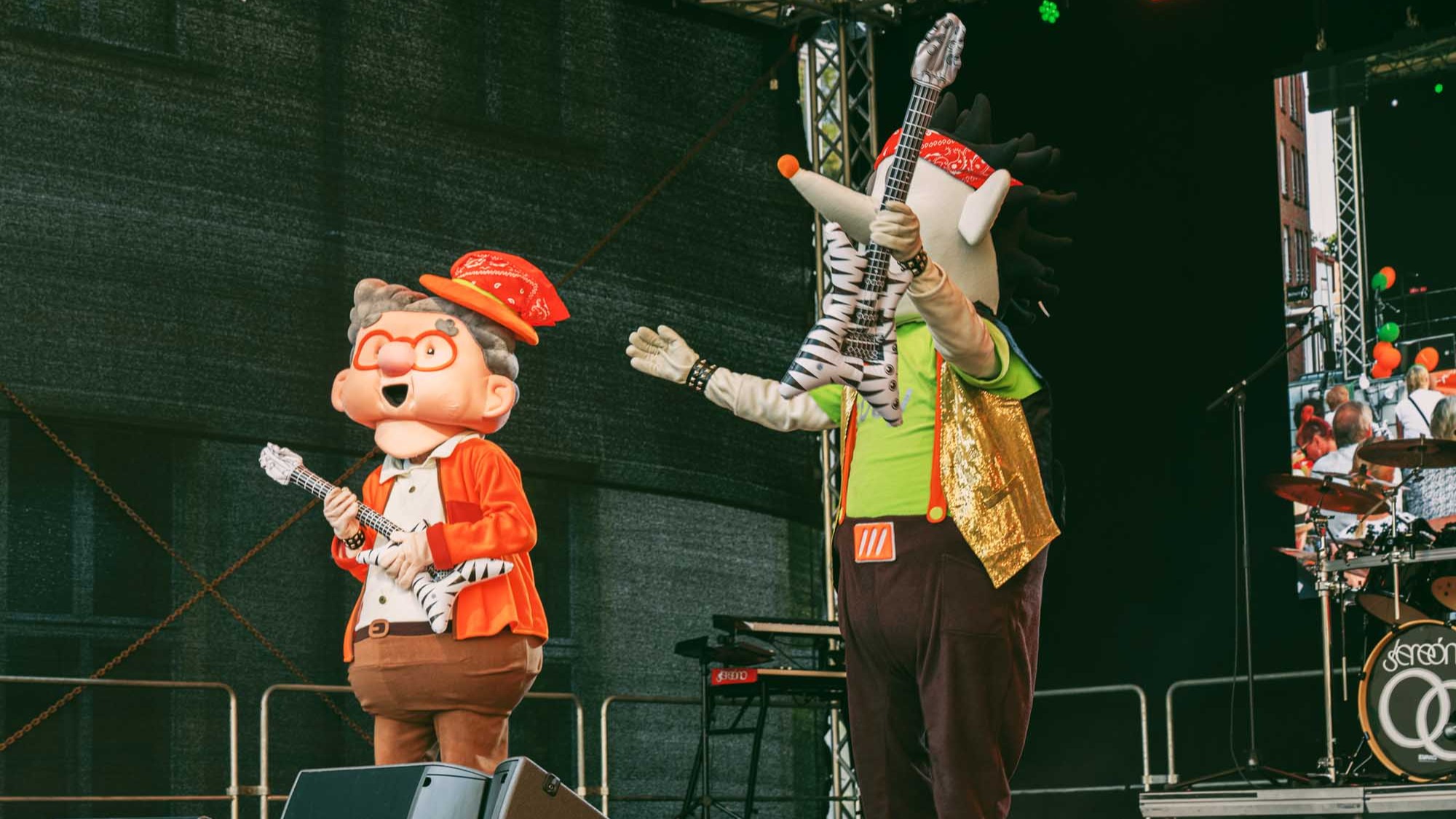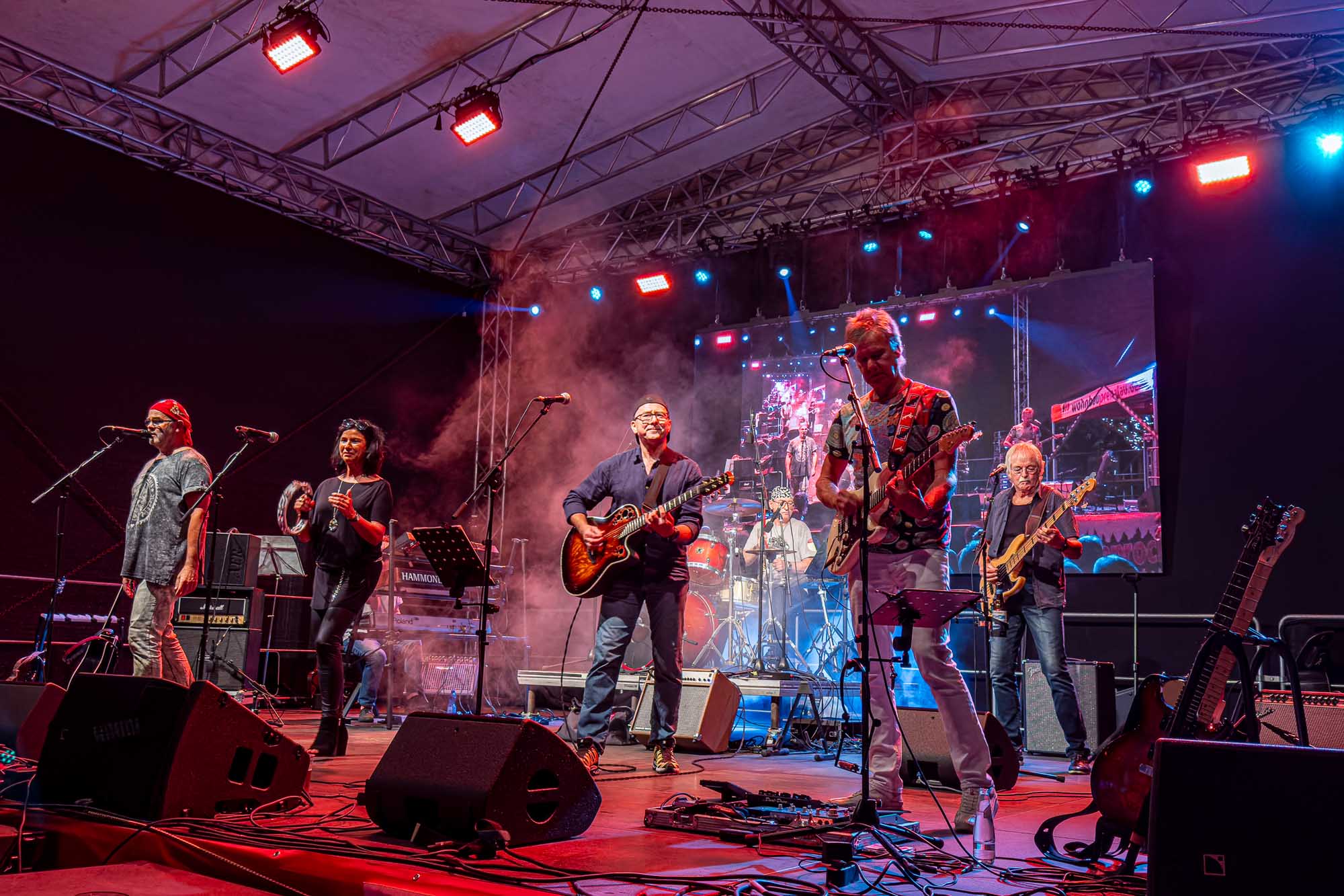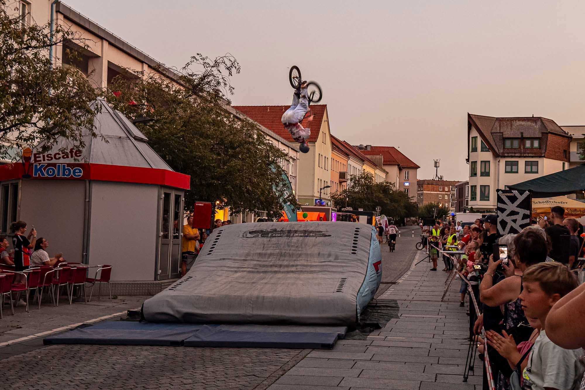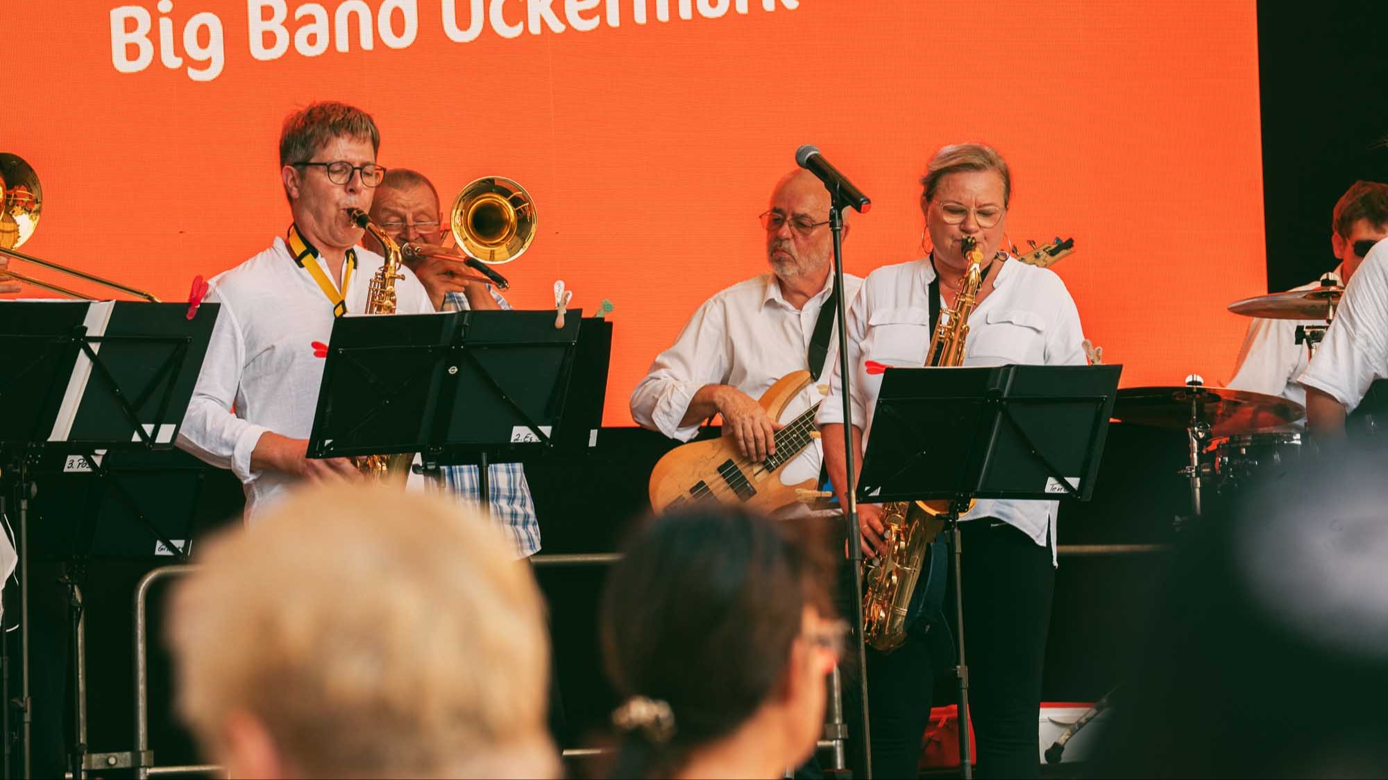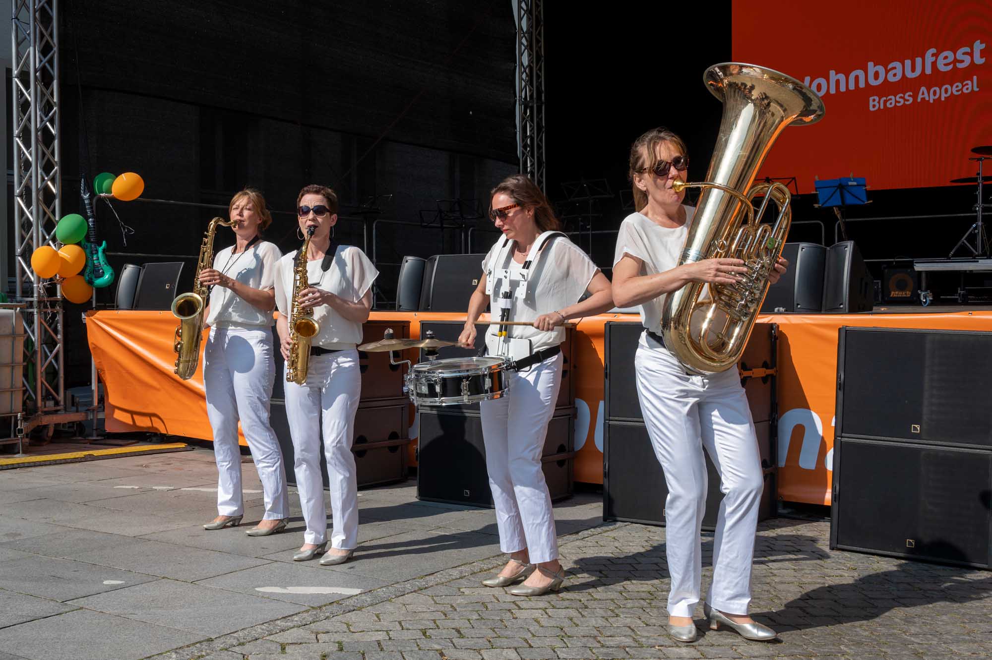 »Prenzlau macht sein Ding«, sang Udo Lindenberg Double EXE, der den musikalischen Auftakt mit beliebten Songs der deutschen Rock-Ikone machte. Während der Umbauzeiten sorgte die Berliner Frauengruppe »Brass Appeal« mit Blasinstrumenten für gute Laune. Anschließend begeisterte die Big Band Uckermark mit einem breiten Repertoire an bekannten Liedern, die Jung und Alt zum Mitwippen brachten. Besonders großen Anklang fand das Tanzstudio Swing, das zu rockigen Klängen eine energiegeladene Zumba-Performance zeigte. Wohnbau-Maskottchen Eddy und Friedrich ließen es sich nicht nehmen, sich ebenfalls tänzerisch zu versuchen und brachten die Prenzlauerinnen und Prenzlauer mit einer eigenen Choreografie zu »We Will Rock You« zum Jubeln. Auch die Nachwuchsband Stereono aus Rostock, um den Prenzlauer Gian Luca Urland, war Teil des Programms. Die Band beeindruckte mit ihrem musikalischen Können. Für gute Stimmung sorgten »Die Kassenpatienten« aus Leipzig, die mit bekannten Liedern der »Ärzte« und einer großen Portion Humor das Publikum begeisterten. Die BMX-Show »Friss Dreck«, die mitten in der Friedrichstraße stattfand, ließ vor allem die Herzen der jungen Zuschauerinnen höherschlagen. Die Jungs zeigten spektakuläre Sprünge und brachten die Menge zum Staunen. Als krönender Abschluss des Abends rockte Prenzlaus Lieblingsband F.altenrock die Bühne. Es wurde getanzt, mitgesungen und ausgelassen gefeiert.