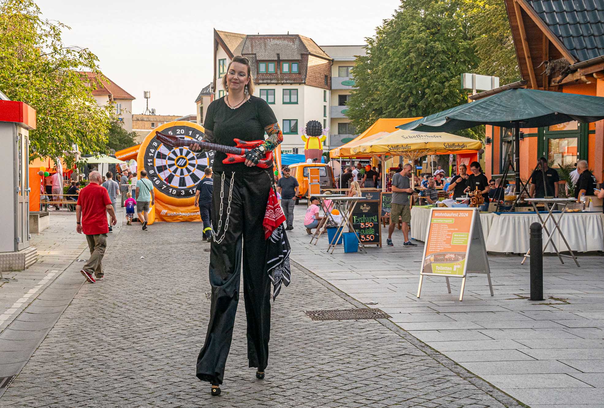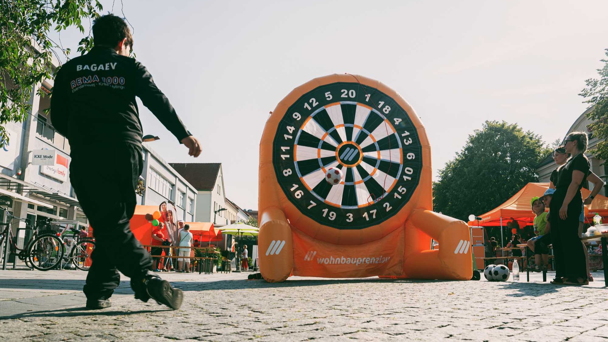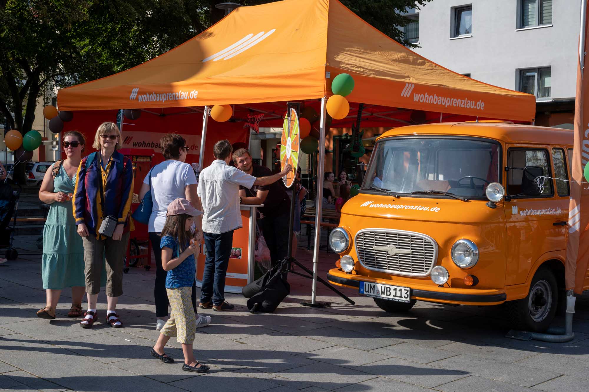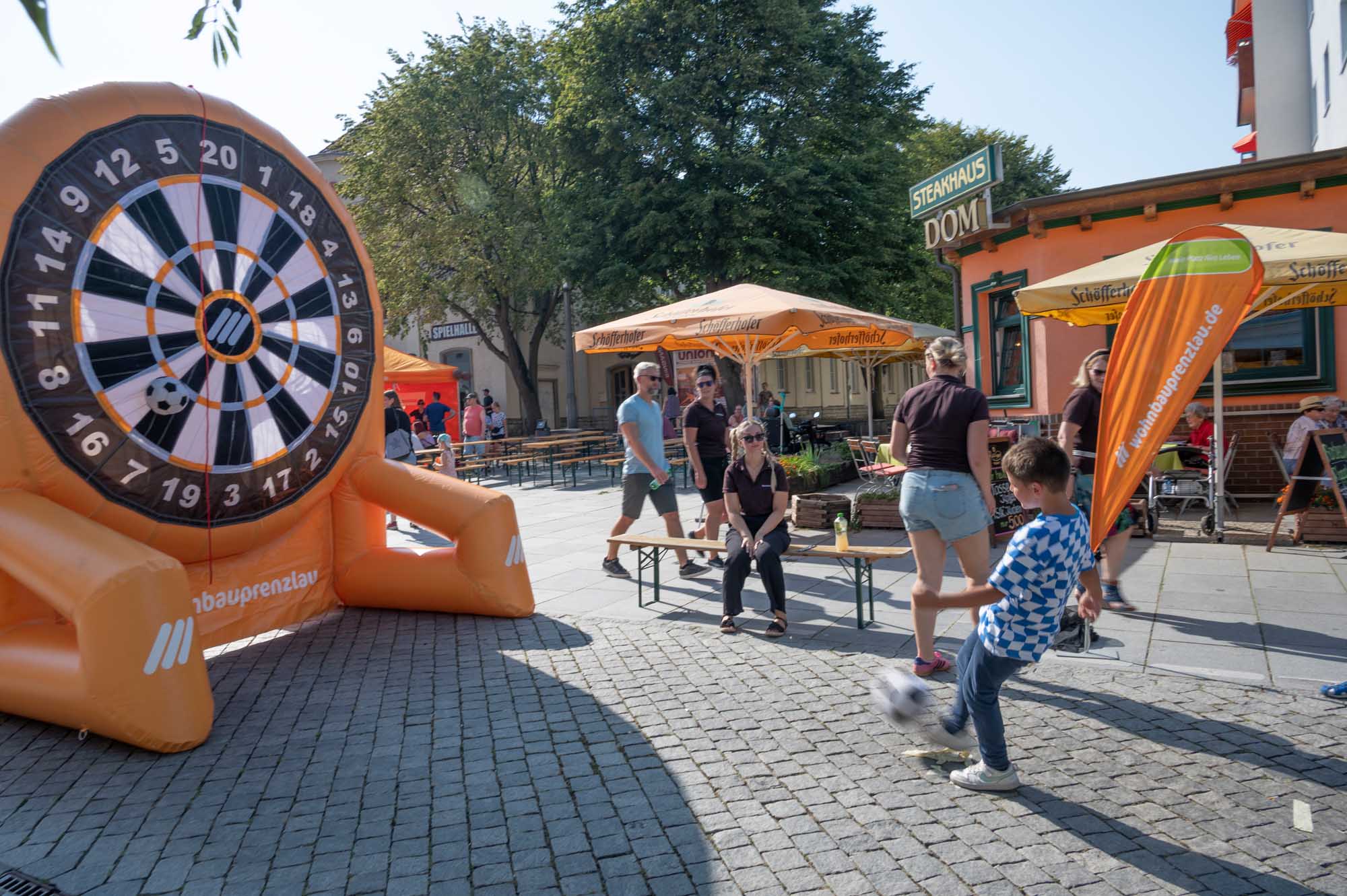 Doch nicht nur musikalisch hatte das Wohnbaufest viel zu bieten: Zahlreiche Mitmach-Aktionen wie Hüpfburgen, Bastelstände und eine Kindereisenbahn luden zum Verweilen ein. Beim Buzzer-Duell konnten die Besucherinnen und Besucher ihre Schnelligkeit unter Beweis stellen. Besonderes Highlight war das neue Fußball-Dart der Wohnbau Prenzlau: Auf beiden Seiten bespielbar, konnten Groß und Klein ihre Treffsicherheit testen. Kostenfreies Popcorn, tolle Gewinne am Glücksrad und das Werner-Mobil als beliebtes Fotomotiv rundeten das Rahmenprogramm ab. Um das leibliche Wohl kümmerten sich regionale Gastronomen: Das Restaurant Dom, das Wein- und Teehaus Gotzmann und Potato-Tours verwöhnten die Gäste mit einer Vielzahl an Speisen. Die Eis-Zauberei aus Schwedt sorgte für eine Abkühlung mit leckerem Eis.