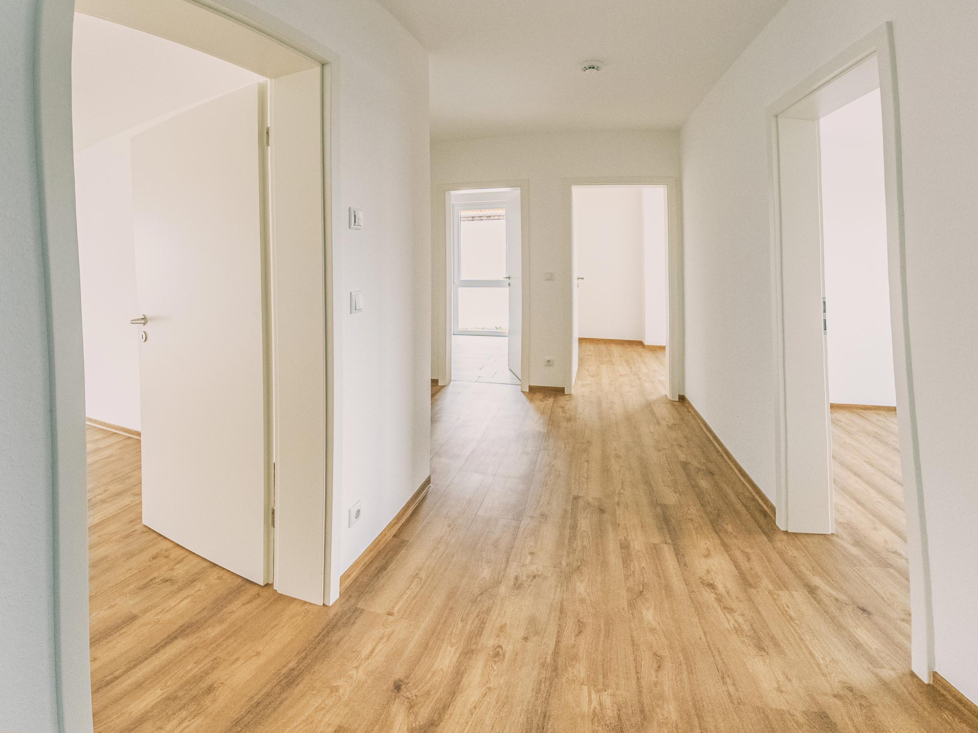 Die Wohnungen im Erdgeschoss sind barrierefrei und altersgerecht angelegt. Im Badezimmer gibt es eine ebenerdige Dusche und den Anschluss für die Waschmaschine. Alle Zimmer sind vom Flur der Wohnung aus zu erreichen. Die Küche und das Bad verfügen zudem über ein Fenster und sind gefliest. In den gut 11 m² großen Küchen ist Platz für einen Esstisch. Das Wohnzimmer bietet mit 20 m² Raum zum Entspannen. Die Schlafzimmer sind zwischen 12 und 14 m² groß. Eine Abstellkammer bietet zusätzlichen Stauraum.