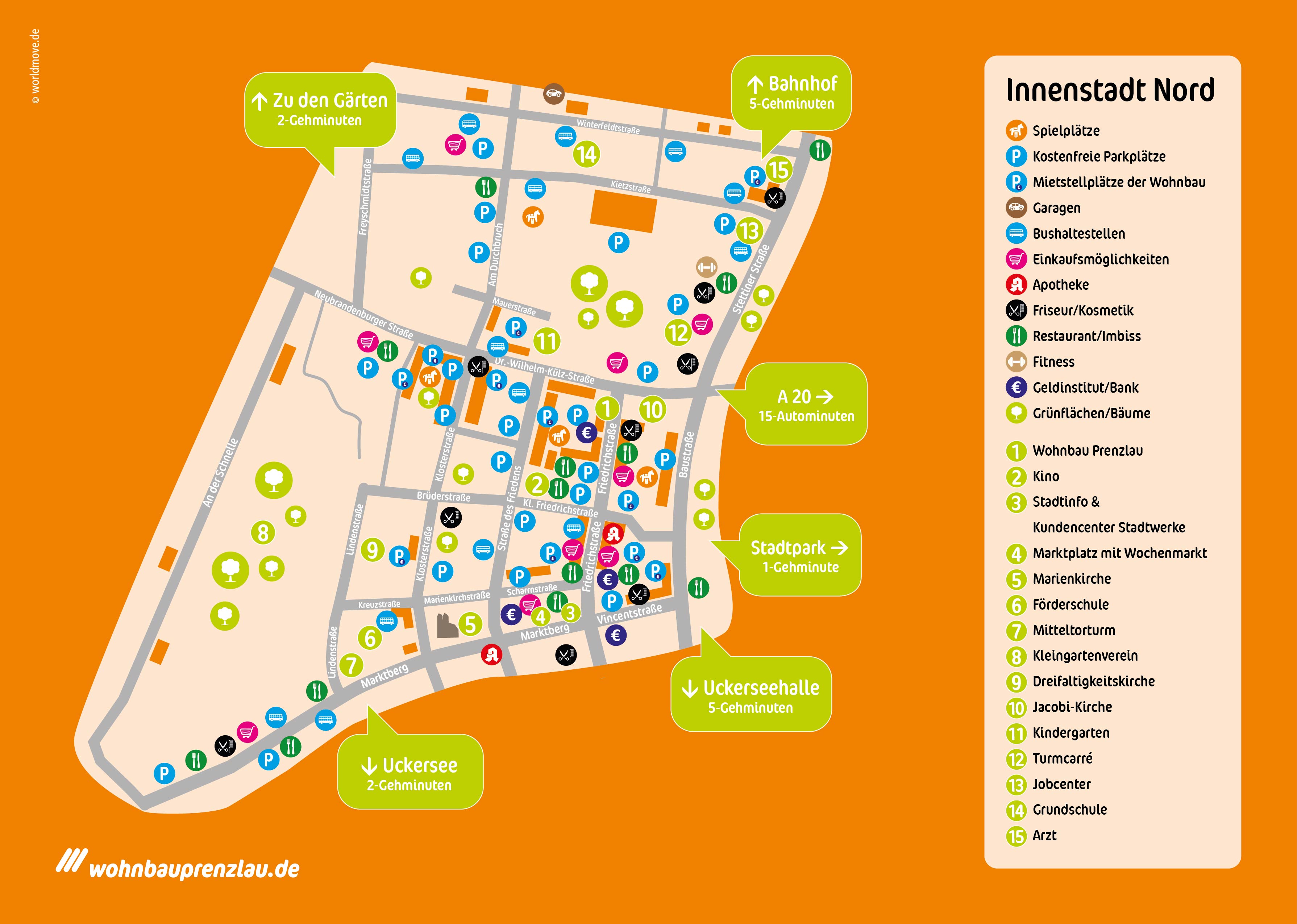 In der Innenstadt Nord wird es nie langweilig. Vielfältige Geschäfte tummeln sich entlang der Friedrichstraße; Prenzlaus EinkaufsMeile in der vor allem an den Wochenenden die verschiedensten Veranstaltungen zum Verweilen und Ausprobieren einladen. Sehenswürdigkeiten, wie die Marienkirche oder der Mitteltorturm, gehören ebenso ins Zentrum, wie der Wochenmarkt auf dem Marktberg.