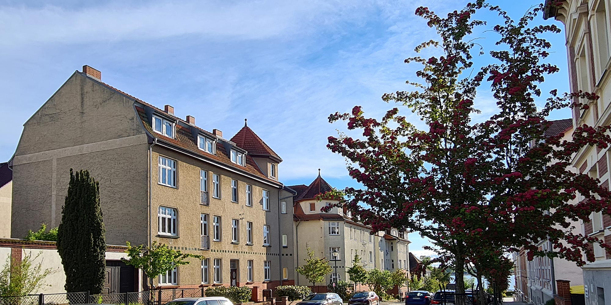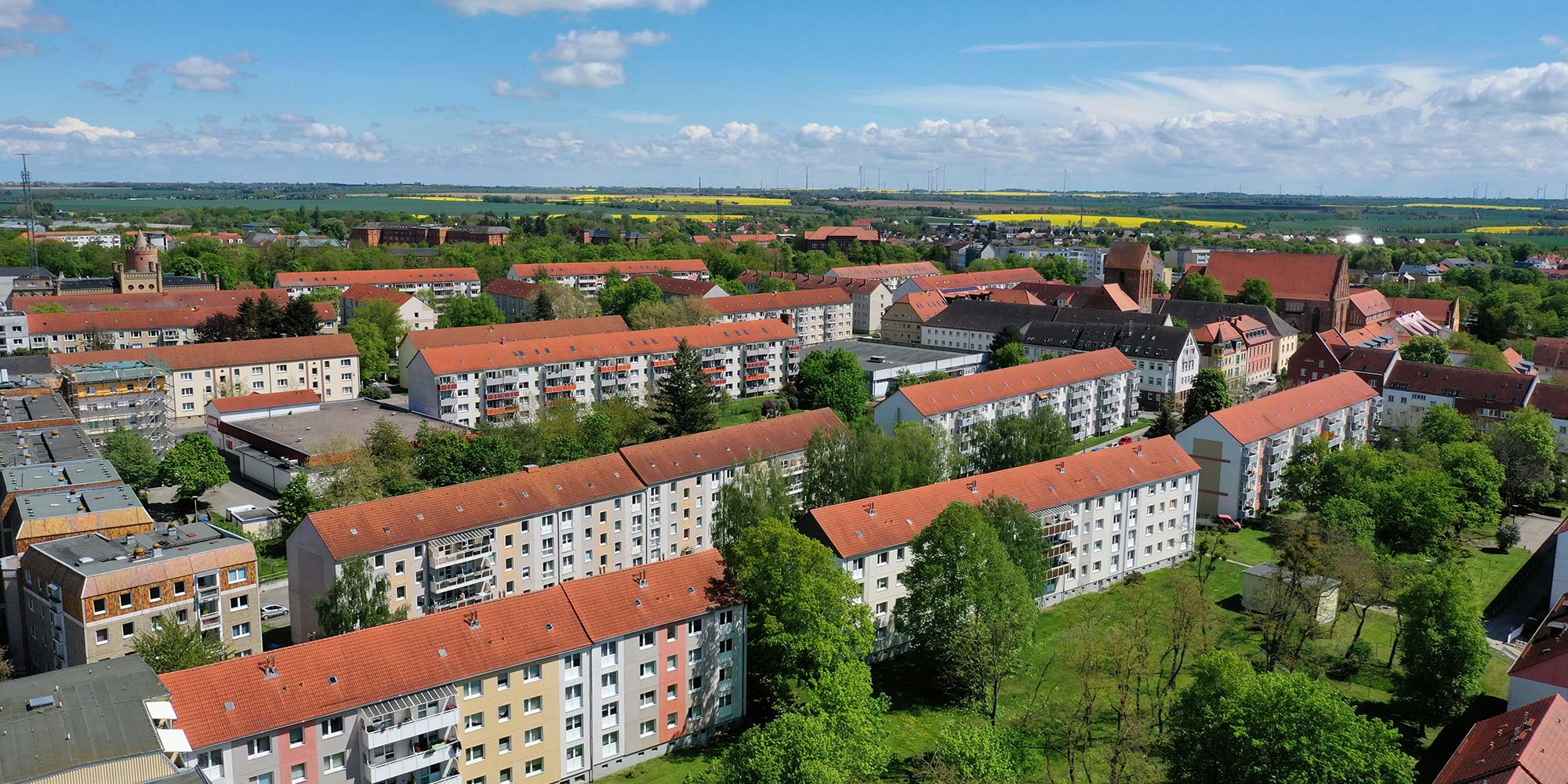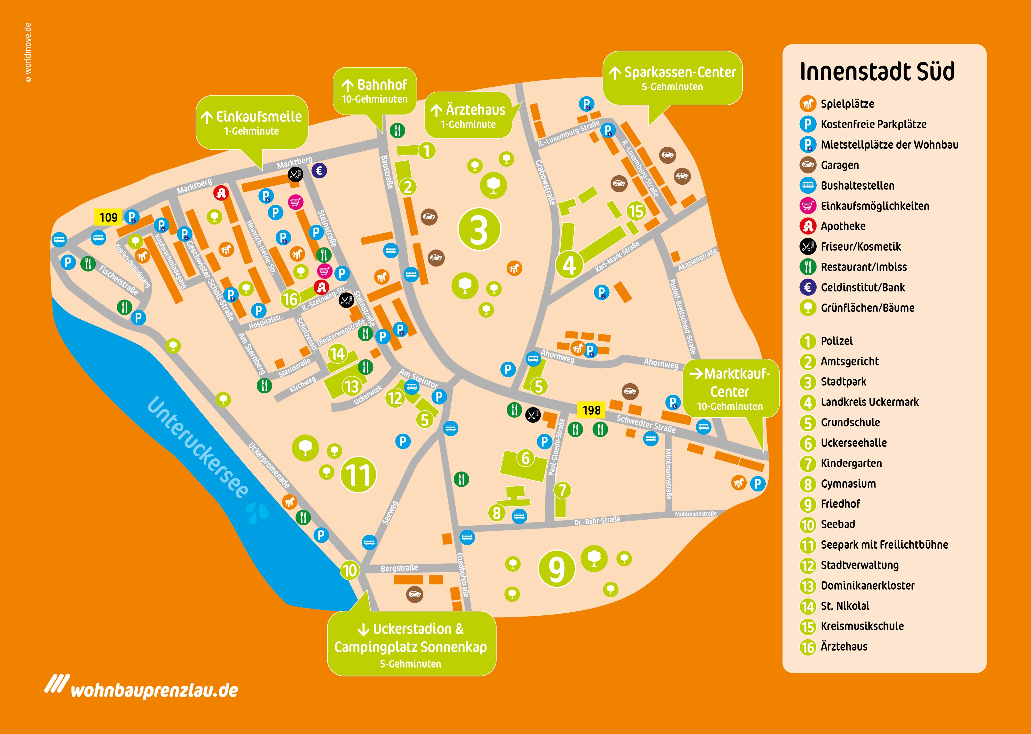 Zwischen dem Blindower Tor und dem Uckersee vermietet die Wohnbau Prenzlau mehr als 2.000 Wohnungen. Neben den zahlreichen Mehrfamilienhäusern, die vorrangig zu DDR-Zeiten gebaut wurden, ist das Stadtbild historisch geprägt. Die Stadtmauer ist gut erhalten und zahlreiche Kirchen gestalten die Nachbarschaft. Die größte von ihnen, die Marienkirche, ist eines der Wahrzeichen der Stadt Prenzlau.